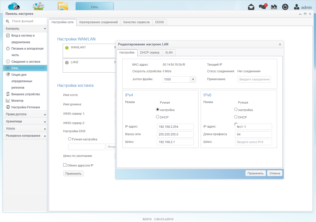 Устройство оборудовано двумя гигабитными сетевыми портами. Из дополнительных функций здесь поддерживаются Jumbo Frames, IPv6, VLAN, режим объединения портов, QoS, DDNS с несколькими сервисами, протокол UPnP для автоматической настройки трансляции портов на роутере, SNMP для удаленного контроля.