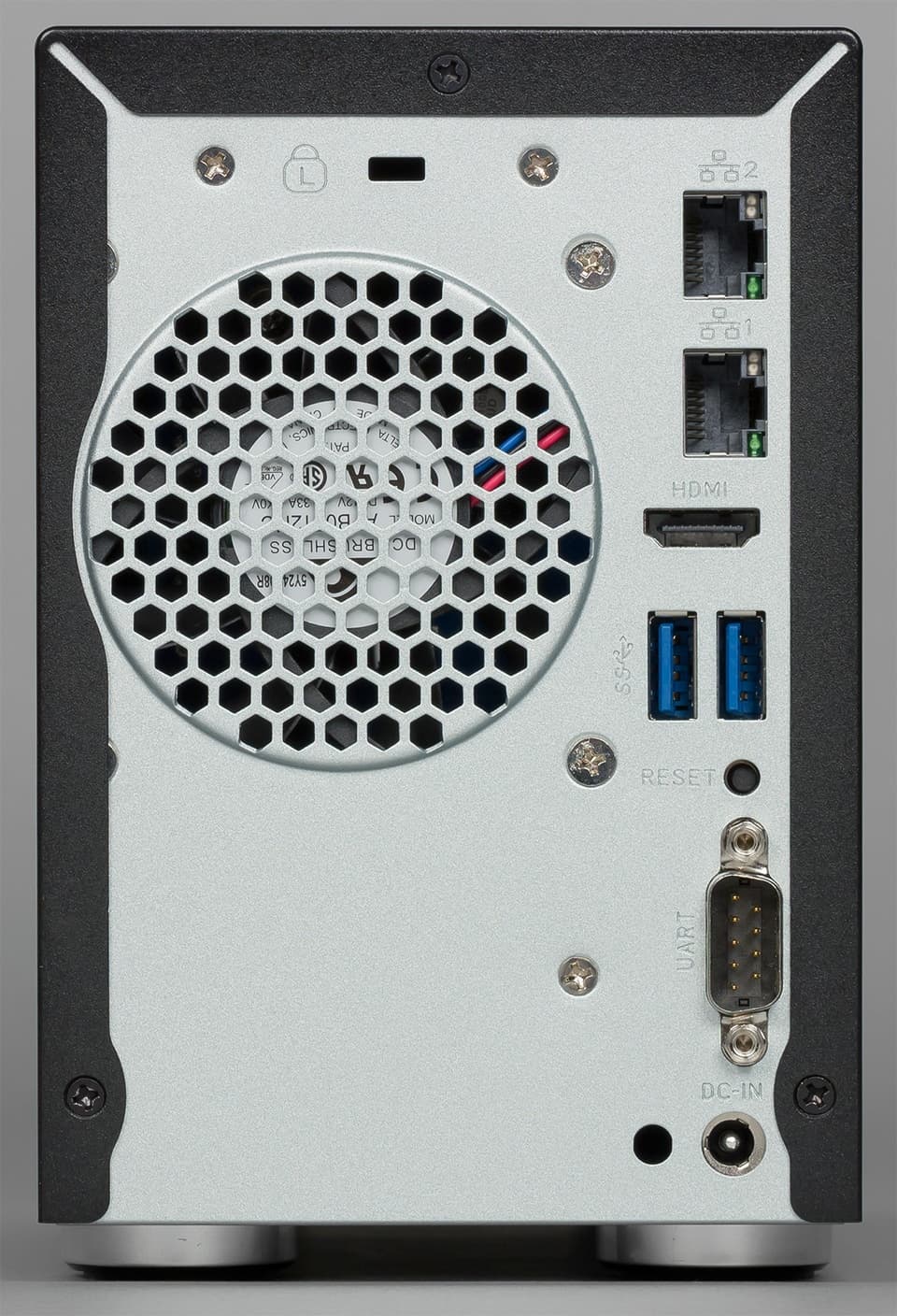 Сзади мы видим решетку вентилятора, работающего на выдув. Воздух в систему охлаждения поступает через дисковые отсеки и небольшую дополнительную решетку на дне корпуса. По правой стороне задней панели установлены основные разъемы: два гигабитных сетевых порта с индикаторами, порт HDMI, два порта USB 3.0, скрытая кнопка сброса, последовательный порт и вход блока питания. Около последнего находится отверстие для установки специального крепления кабеля, исключающего его случайное отключение. А сверху мы видим стандартный кенсингтонский замок. Отметим, что порты расположены достаточно плотно, и для крупных USB-устройств может потребоваться подключение через кабель.