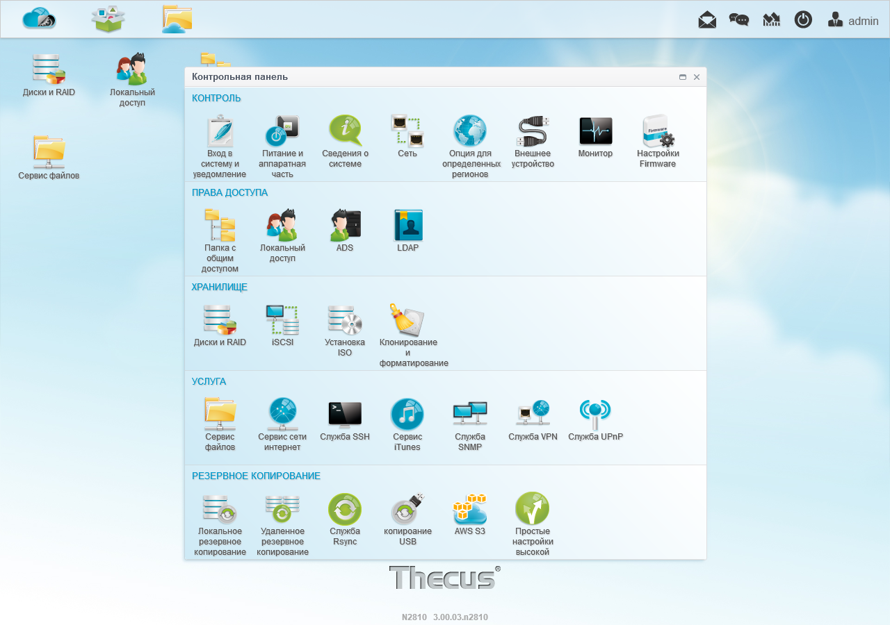 На верхнем уровне в штатной прошивке есть три элемента: панель управления, центр приложений и файловый менеджер. Если войти под аккаунтом пользователя, то панель управления не будет доступна, но можно будет работать с файлами и разрешенными модулями.