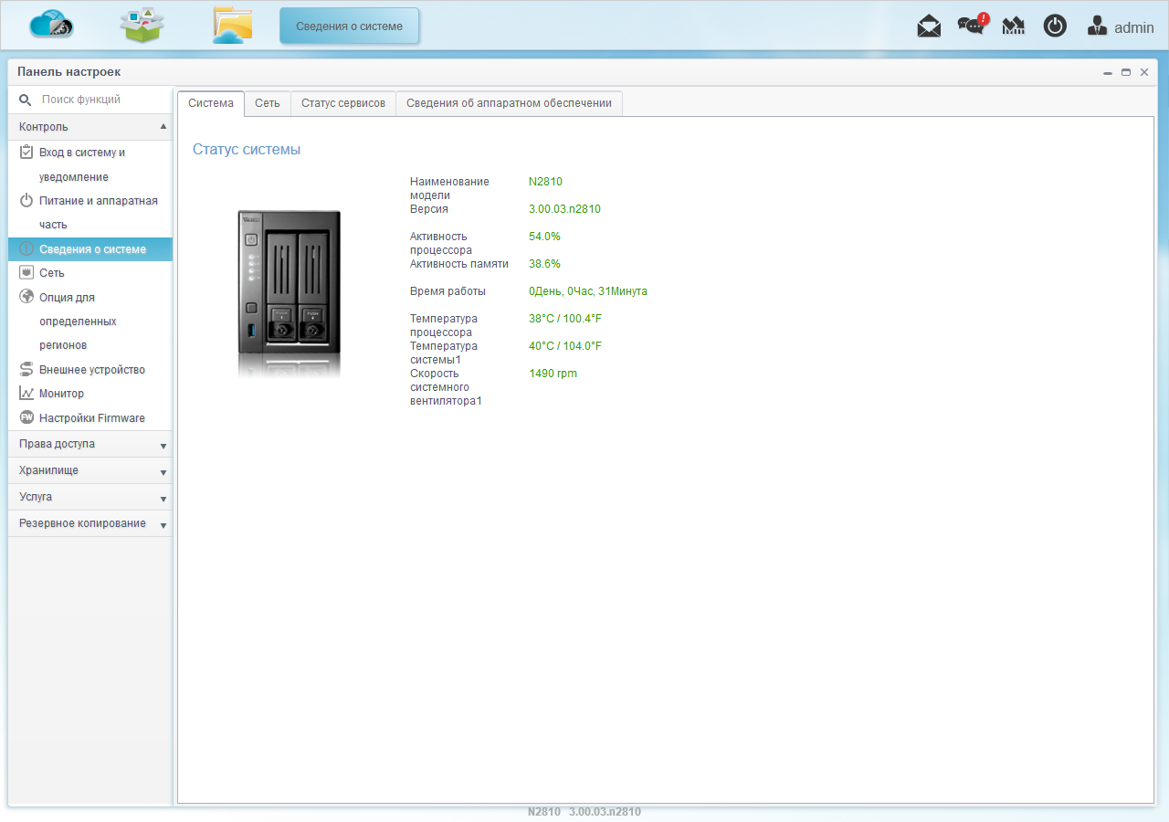 В группе страниц «Сведения о системе» можно узнать версию прошивки, время работы, температуры процессора и платы, скорость вращения вентилятора, сетевые адреса. Также есть информация об активных сервисах и список аппаратных характеристик устройства.