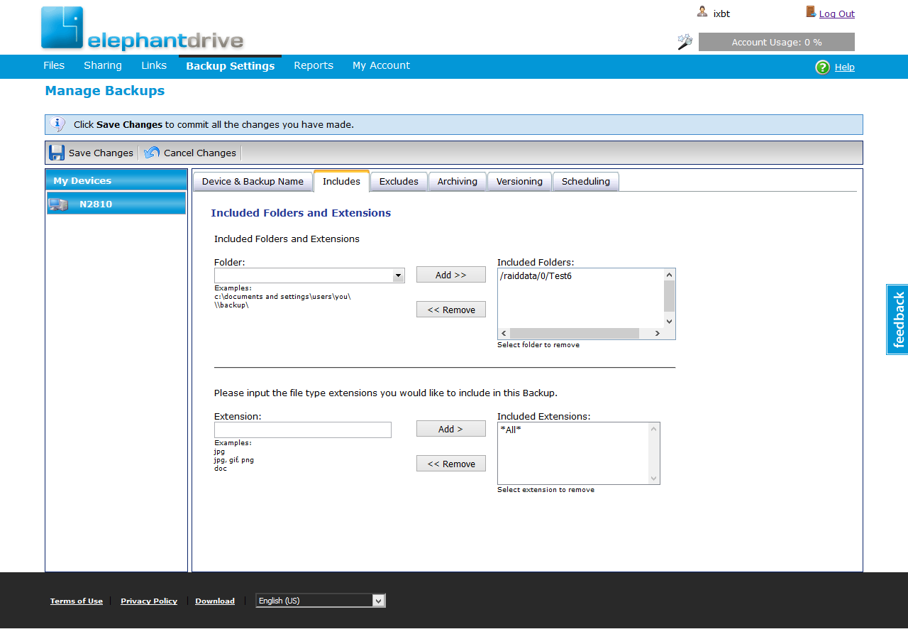 Работа с ElephantDrive устроена иначе. Устанавливаемый на сетевой накопитель агент реализует доступ к данному устройству со стороны облачного сервиса. Так что на самом NAS вы только указываете данные своего аккаунта и разрешаете работу модуля. Все остальные операции, в частности настройка резервирования папок сервера в облако, осуществляются через веб-интерфейс данного сервиса.