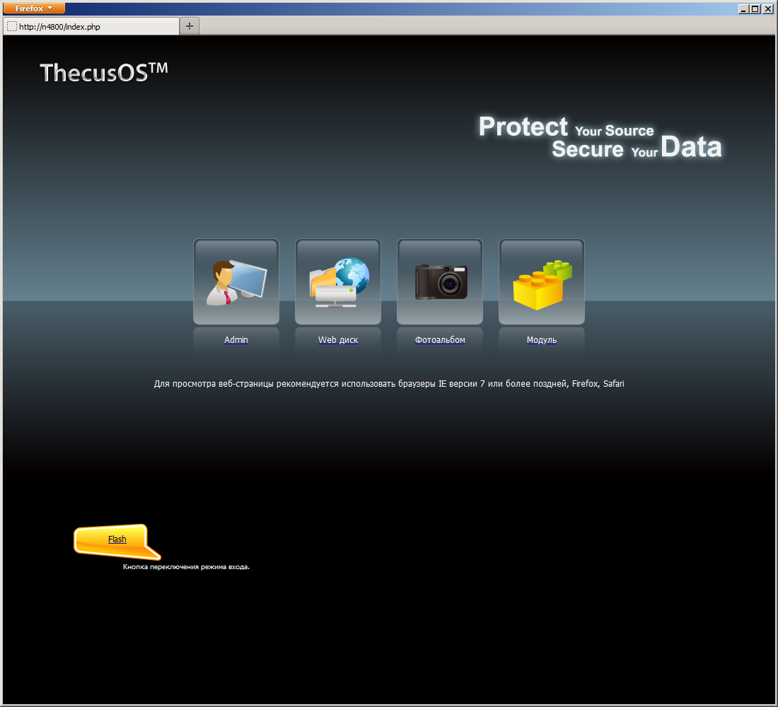 Основным вариантом настройки устройства является привычный web-интерфейс. У Thecus он представлен в традиционном формате дерева меню в левой части экрана и основного окна в центре. Также отметим наличие переводов, в том числе на русский язык, поддержки HTTPS (в том числе — загрузка собственных сертификатов), опции изменения рабочих портов, дополнительных служебных иконок/ссылок, встроенной справочной системы. При первом входе предлагается установить несколько основных опций — настроить систему оповещения администратора по электронной почте, создать дисковый том и локального пользователя. На странице «Избранное» можно собрать ссылки на наиболее часто используемые опции.