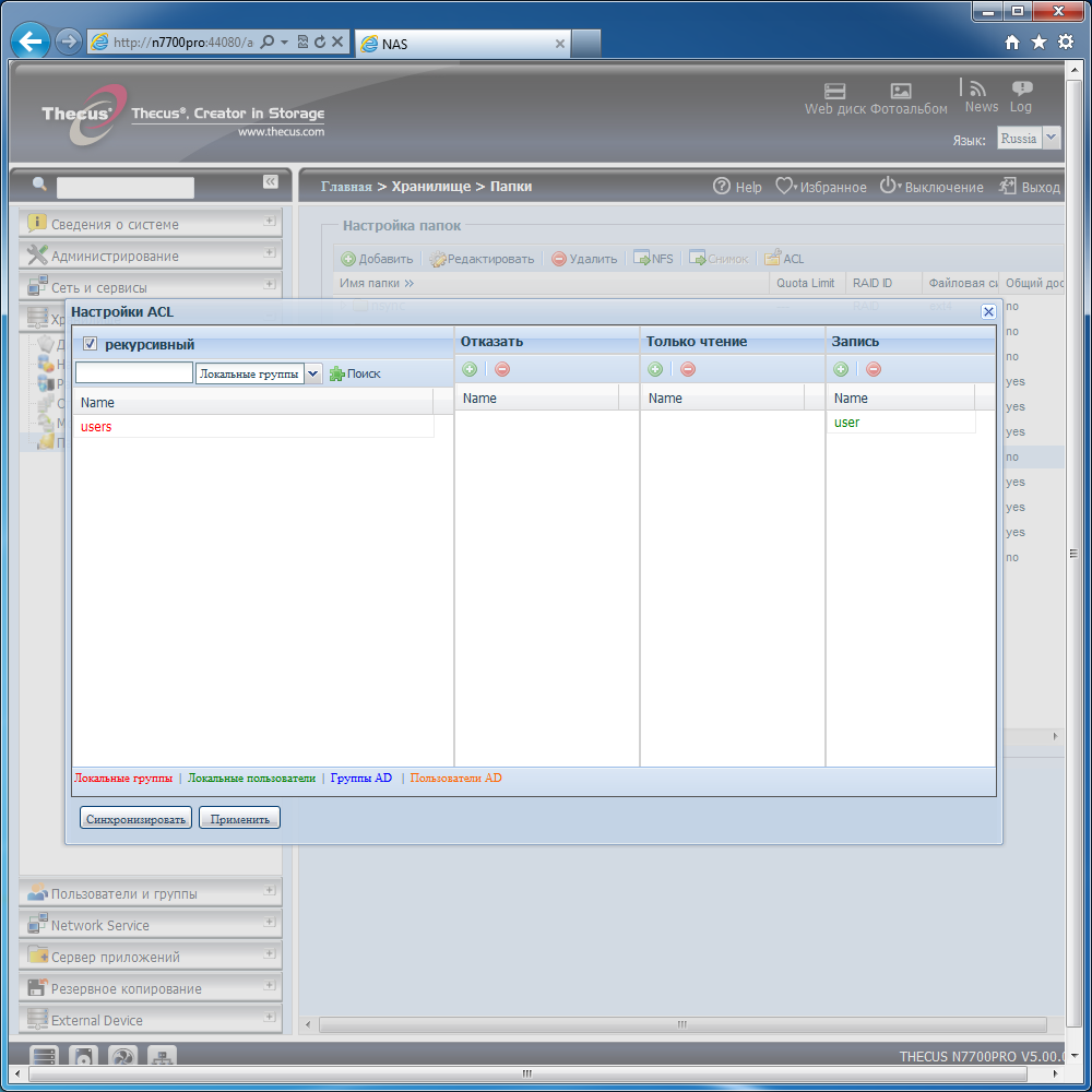 N7700 Pro имеет возможность и самому монтировать удаленные тома iSCSI и представлять их для пользователя в виде обычных сетевых папок. Таких подключений может быть максимум пять. Не очень понятна ситуация с файловыми системами подключаемых томов — в справочной системе информации по этому вопросу мы не нашли. Попытка использовать NTFS провалилась, но накопитель предложил отформатировать новый том в свою файловую систему. Последующая проверка показала, что это была ReiserFS, что, прямо скажем, необычно. Для данного типа ресурсов, как и для обычных папок, администратор может установить нужные ему права доступа для пользователей и групп.