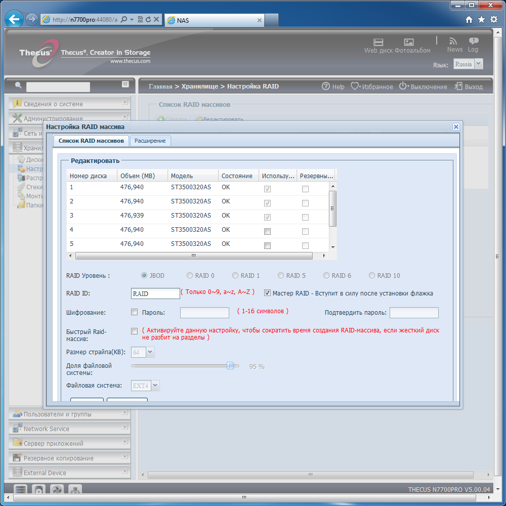 Наличие такого большого числа дисков позволяет реализовать множество конфигураций RAID. Рассматриваемая модель поддерживает режимы 0, 1, 5, 6, 10 и JBOD. Причем во время создания массива есть опция по выбору размера блока и файловой системы. Накопитель умеет работать с EXT3, EXT4, ZFS и XFS. Такое богатство нам встречалось только в устройствах компании Thecus. Предусмотрены опции по автоматическому восстановлению, резервному диску, миграции и расширению томов без потери данных и остановки устройства. Но вот создание нового тома сопровождается отключением текущих сервисов, что, конечно, не очень удобно, учитывая корпоративную направленность модели. Немного смягчить эффект может функция «быстрый рэйд», которая позволит создать новый массив практически мгновенно, но применима она только для чистых винчестеров. Еще одним необычным ограничением служит максимальное число томов — можно создать только три, хотя дисков в накопителе семь.