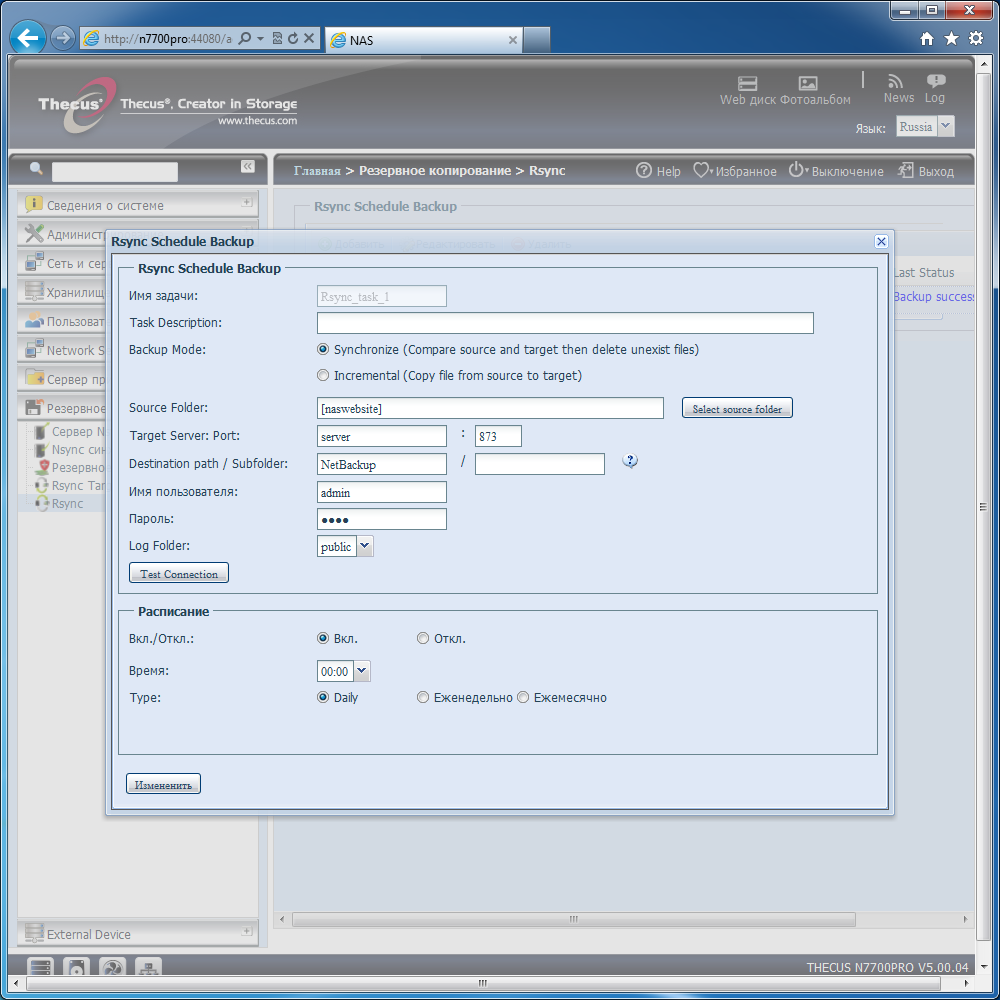 Большинство производителей сетевых накопителей реализуют встроенные системы резервного копирования. Не обошлось без этого и в N7700 Pro. Устройство поддерживает работу с аналогичными моделями Thecus по специальному протоколу, с серверами FTP, а также и со стандартным rsync. Соответственно оно может выступать и сервером для этих протоколов.