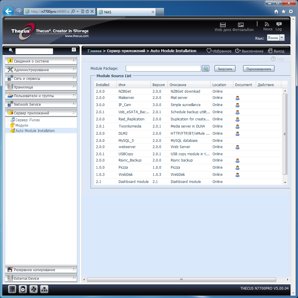 В отличие от других известных производителей, Thecus реализовал в основной прошивке только базовые функции сетевого накопителя. Пожалуй, для корпоративной модели это более удобный вариант, чем интеграция многочисленных дополнительных сервисов в прошивку. Так что у вас есть возможность самостоятельно определить, что еще требуется от накопителя, и установить нужные модули.