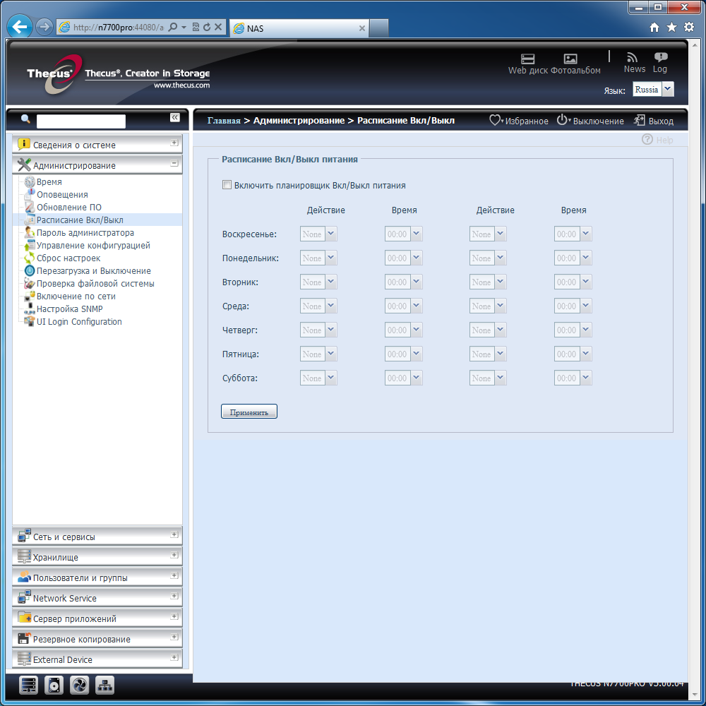 Одно из возможных расписаний позволяет указать время работы накопителя для каждого дня недели. Кроме того, есть возможность включения и перезагрузки устройства через web-интерфейс, поддержка WOL — включения по сети и отключение питания дисков в случае отсутствия активности.