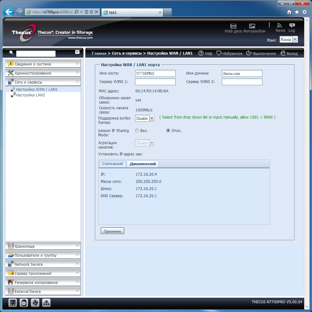 Thecus N7700 Pro имеет два гигабитных сетевых интерфейса. Оба поддерживают автоматическую или ручную установку адресов и Jumbo Frames до 9000 байт. При необходимости интерфейсы можно объединить для увеличения скорости и/или надежности. Второй вариант использования второго интерфейса — подключение дополнительного сегмента локальной сети, который будет иметь доступ в основной по технологии NAT. Для упрощения настройки в этом случае можно также включить на втором интерфейсе сервер DHCP.