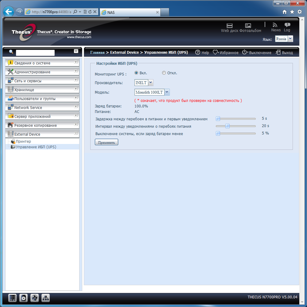 Для источников бесперебойного питания можно использовать интерфейсы USB или последовательный. Не очень удобно то, что пользователь должен выбрать нужную модель устройства из списка, автоматического определения не предусмотрено. Положительный момент — поддерживаются не только ИБП компании APC, но и множества других производителей. Из настроек пользователь может выбрать интервал между сообщениями о пропадании питания и процент оставшегося заряда для безопасного отключения накопителя.