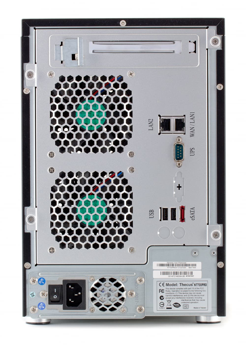 На задней панели расположены решетки двух 92-миллиметровых вентиляторов основной системы охлаждения. В верхней части панели находится слот для карты расширения. Справа — одиноко расположились два гигабитных сетевых порта, последовательный порт для подключения ИБП, два порта USB 2.0 и один eSATA. В нижней части корпуса виден также блок питания, в котором есть еще один вентилятор, в этот раз формата 40 мм.