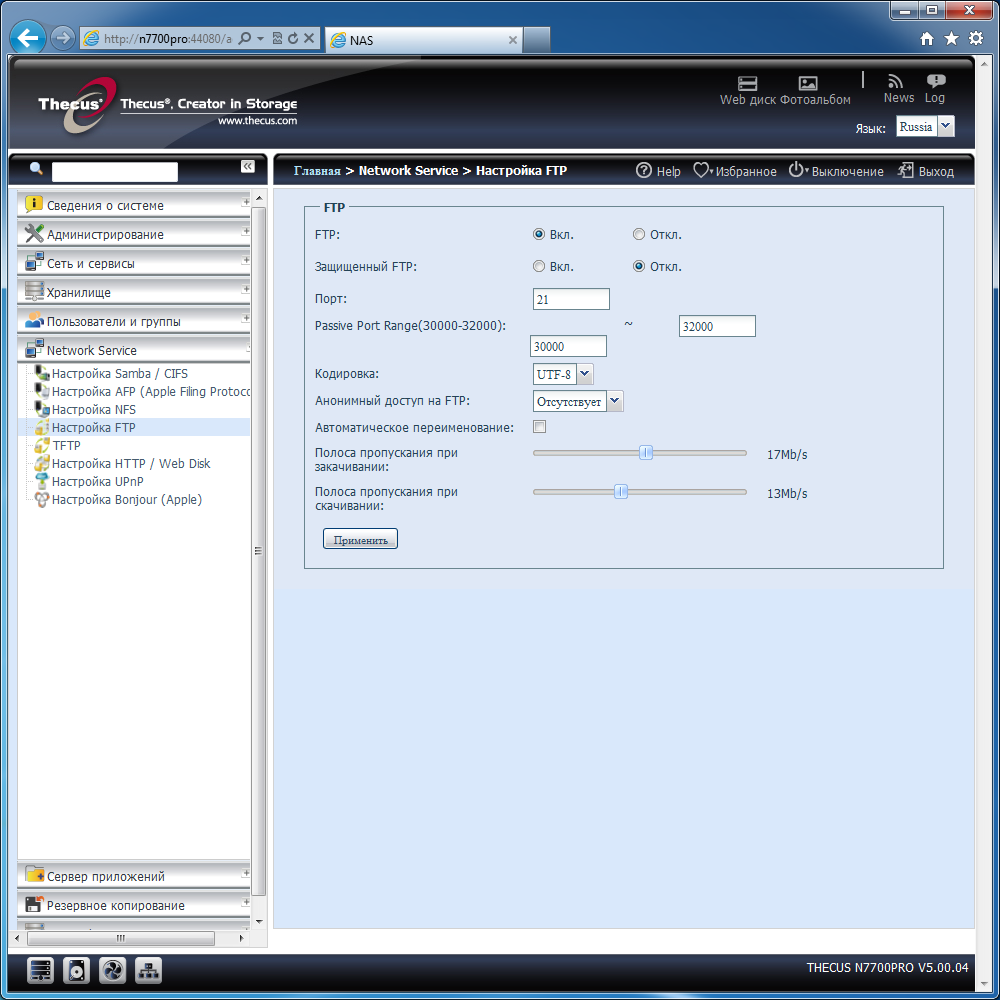 Доступ к сетевым ресурсам предоставляет по протоколам SMB/CIFS, AFP, NFS, FTP, TFTP и HTTP/HTTPS. Для первого из них есть множество дополнительных параметров, включая возможность организации корзины для удаленных файлов. AFP может похвастаться поддержкой Time Machine. NFS можно только включить/выключить. У FTP можно поменять номера портов, в том числе и для пассивного режима, выбрать кодовую страницу, ограничить скорость загрузки и отдачи, ограничить анонимный доступ. TFTP может пригодиться для работы в специальных сценариях, из параметров у него указываются рабочая директория и режим доступа. HTTP/HTTPS реализуется через функцию WebDisk, о ней мы поговорим позже. Отметим только возможность изменения портов и загрузки собственных сертификатов для SSL.