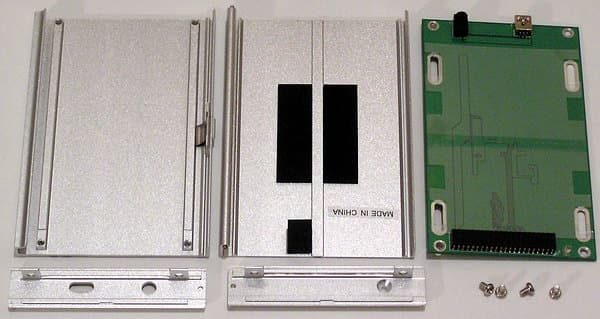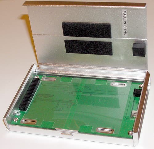 куда недолго думая пользователю предлагается поместить свой винчестер. Просто воткнув в разъем EIDE и не используя каких-либо иных фиксаций диска кроме как резиновым контр-кубиком с противоположной от IDE-разъема стороны на крышке и пористыми прокладками там же, прижимающими диск сверху к печатной плате, когда «ларчик захлопнут».