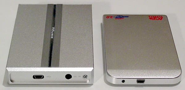 Пару слов о размерах инкложи TT A2291. Полгода назад я воодушевленно расписывал прелести миниатюрнейшего (насколько возможно) и при этом дешевого контейнера для таких же винчестеров AgeStar IUB2O1. К хорошему, как водится, привыкаешь быстро, поэтому появление новых продуктов, уступающих хоть в чем-то прежним полюбившимся, нередко воспринимается в штыки. Двухдюймовая инкложа серии Muse хоть и смотрится эдаким стилягой, габариты имеет отнюдь не самые малые в данном классе устройств: 130×82×20 куб. мм против, например, 118×72×11 для AgeStar IUB2O1, да и вес больше — 155 граммов без диска! Впрочем, лучше один раз увидеть, чем сто раз прочесть, поэтому просто сравним их на фото — сбоку