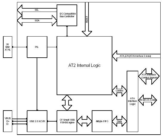 В качестве преобразователя интерфейсов используется микросхема CY7C68300 EZ-USB AT2+ от компании Cypress Semiconductor, поддерживающая ATA6 и ATAPI. Этот USB-мост четвертого поколения считается достаточно удачным и универсальным решением, хотя и не самым новым, поскольку вышел летом 2002 года, и применяется также в других подобных продуктах, например, от Sarotech. Цена его составляет менее 4 долларов оптом.