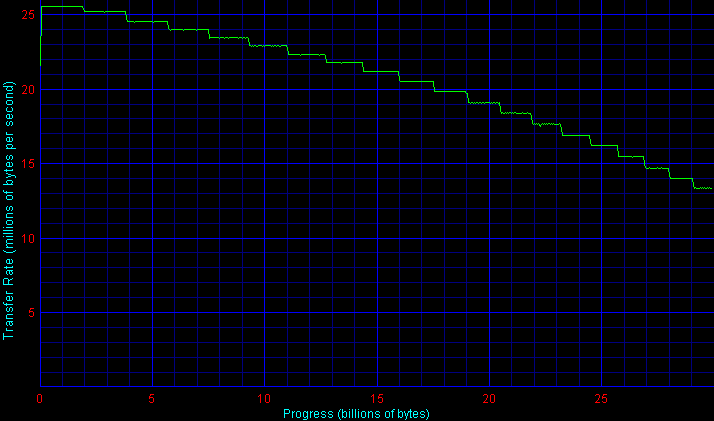 Здесь получаем классический случай идеального результата. Все как положено — диски расположились в соответствии с плотностью записи, модели одной линейки показали одинаковые результаты. Красота! Везде бы так.