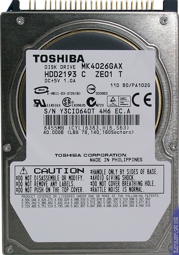 Самый новый диск из тестируемых сегодня. Как было нами выяснено ранее, две правые цифры в названии модели имеют отношение к последовательности выпуска дисков. Чем больше указанное число, тем позже была выпущена конкретная модель, причем не имеет значения, какова скорость вращения шпинделя у данного диска, 4200 или 5400 (на это указывает буквенный индекс — GAS или GAX, соответственно). На данный момент 26 — максимальное значение, указанное на сайте Toshiba, поэтому можно сделать вывод, что ныне это последняя модель в ряду дисков форм-фактора 2,5 дюйма. С первыми двумя цифрами все проще — это объем в гигабайтах. В обзоре диска в очередной раз прописывается штамп «диск имеет наибольшую в индустрии [производства мобильных винчестеров] плотность записи, равную» на этот раз 57,9 Gbits/sq.inch. Что касается остальной информации, то такое ощущение, что она пишется под копирку из диска в диск, не изменяясь годами. Из нововведений следует отметить использование интерфейса ATA-6.