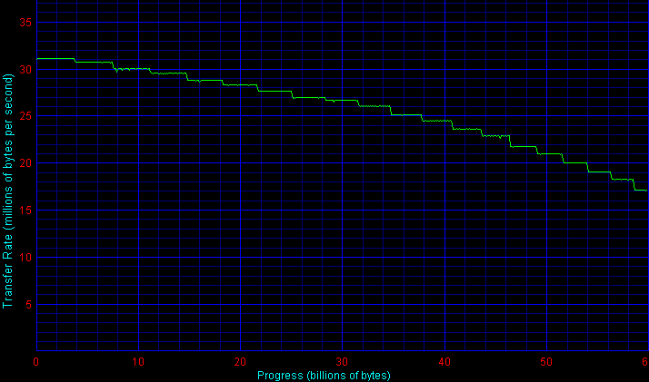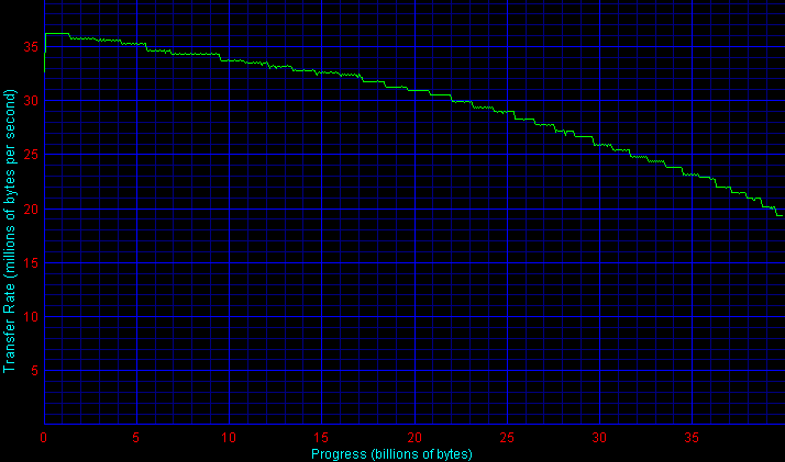 При последовательной записи MK6022GAX завоевал свое «честное» второе место. MK4026GAX опять-таки выходит на максимальную скорость при большем размере блока. Интересно, что характерные для дисков Toshiba «волны» у MK4019GAX сдвинуты по отношению к MK6022GAX и MK4026GAX, причем у последнего диска этот эффект просматривается в наименьшей степени.