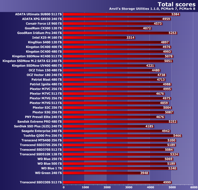 Как уже не раз было сказано, зачастую сегодня уже сложно различить производительность твердотельных накопителей существенно разных классов — поскольку «узкое место» находится не в них: требования ПО превосходят возможности механики, но с легкостью удовлетворяются любым SSD. Впрочем, если вооружиться тестами, небольшие различия в результатах найти можно. И они в целом не в пользу 230S — он из тройки испытуемых оказался самым медленным. Незначительно, конечно, но проигрыша SU800 мы не ожидали.