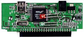 Открутив два болта, мы попадаем внутрь устройства, а там… практически ничего нет :) Только место для стандартного винчестера диаметром 2.5″ да основная платка, в которой и заключен весь смысл устройства — на ней расположены микросхемы моста USB-IDE.
