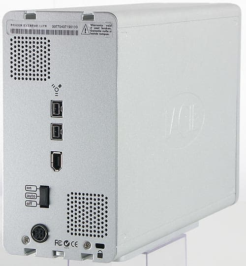 Задний торец выглядит интереснее. Помимо вполне стандартных элементов, типа разъема для подключения БП или крепления замка Кенсингтона, хорошо заметны три интерфейсных разъема, два вентилятора за решетками и трехпозиционный переключатель питания. В среднем положении на него можно не обращать внимания — управление будет осуществляться с передней панели, а крайние позиции позволяют включить или выключить накопитель «наглухо» (полезно, опять же, в стойке). Один из разъемов — стандартный 6-ти контактный FireWire 400, два других — 9-ти контактные FireWire 800. Первый идеально подходит для обеспечения совместимости, остальные — для получения максимальной скорости, особенно в том случае, когда несколько подобных накопителей соединяются в цепочку. Что касается вентиляторов, то оба ревут от души: возможно, конструкторам стоило бы предусмотреть места для пары 80 мм пропеллеров, которые при более низкой частоте вращения обеспечили бы такой же или даже больший воздушный поток. С другой стороны, стоечные серверы тишиной вообще не отличаются, так что на их фоне кулеров в Bigger Disk Extreme вы попросту не услышите. При настольном использовании хорошо помогает интеллектуальность системы охлаждения — вентиляторы включаются лишь по достижении определенного уровня температуры внутри коробки. Во время прохождения тестов, когда накопитель был постоянно загружен работой, такое происходило пару раз в час на небольшое время, что перенести вполне реально.