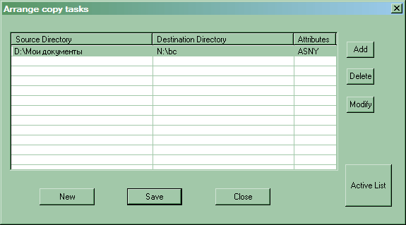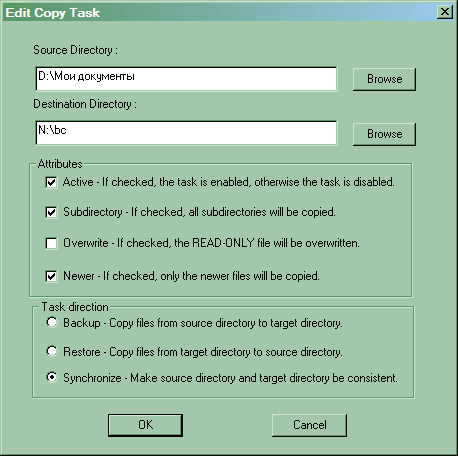Создадим новое задание. Допустим, бэкапить будем папку «Мои документы» — это всегда полезно. Выберем «направление» — данные могут копироваться в одну или в другую сторону, либо просто синхронизироваться. Атрибуты позволяют настроить поведение утилиты — будут ли обрабатываться вложенные каталоги, перезаписываться файлы только для чтения, да и вообще — будет ли данное задание активно. Стоит обратить также внимание на флажок «Newer» — если его не устанавливать, то утилита попытается честно перезаписывать все файлы, а не только более новые их версии.