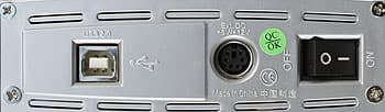 Задний торец чуть сложнее, хотя и не сказать, чтоб сильно. На нем можно обнаружить стандартный выключатель питания, разъем USB типа B и разъем для подключения внешнего БП типа mini-DIN. Такой подход к питанию обычен для большинства устройств ViPowER (за исключением, конечно, тех, что во внешнем питании не нуждаются), да и не только их.