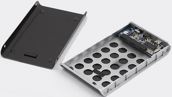 Внимательное изучение позволяет установить, что к цельнометаллическим коробкам IB-270 не относится. Основой конструкции является пластиковая рамка (она хорошо видна и на фотографиях устройства черного цвета в сборе — все серенькое в данном случае пластмасса). Одна из металлических крышек (которая более длинная) прикреплена к ней жестко, вторая же фиксируется четырьмя болтиками. Сам винчестер с металлом непосредственно не контактирует — со стороны микросхем его отделяет от крышки пластиковое дно (которое, дабы не препятствовать вентиляции, состоит в основном из дырок — прямо как шапка почтальона Печкина из второй части известного мультфильма :)), а на вторую крышку наклеена резинка примерно миллиметровой толщины. Плюсы и минусы такой конструкции оценивать достаточно сложно. С одной стороны, винчестер несколько лучше защищен от перегрузок при падении, поскольку часть их возьмут на себя резинки или пластмасса. С другой стороны такая конструкция чуть толще, чем при «голой» укладке диска в коробку (по моим прикидкам в данном случае можно говорить где-то о паре-тройке миллиметров), да и пластмасса все равно не относится к особо прочным материалам, так что швырять ВЖД без страха за его сохранность все-таки не стоит — это вам не ZIV PRO или ZIV mini :)