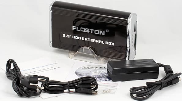 Сам комплект поставки типичен для внешних накопителей на базе 3.5″ винчестеров: модуль, USB-кабель, блок питания (поскольку по шине такие жесткие диски питать невозможно), краткая печатная инструкция, CD с подробным руководством, драйверами для устаревших ОС и программой резервного копирования информации, а также подставка из прозрачной пластмассы для установки модуля в вертикальном положении. Замечу, что, в отличие от прочих модулей Floston, в данном случае это не только декоративный аксессуар — очевидно, что наилучшим образом примененная схема охлаждения винчестера будет работать именно при его вертикальной установке.