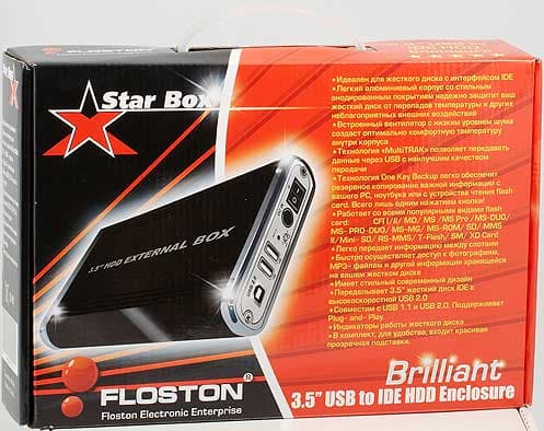 Внешне все модули, поставляемые Floston, очень похоже, независимо от форм-фактора винчестера, на который они рассчитаны. В любом случае, это будет алюминиевая коробка со скругленными длинными ребрами, всеми разъемами на одном торце, и подсвечиваемыми светодиодами пятью звездочками — на втором. Разве что размеры и вес, разумеется, различаются, в зависимости от класса — модели, рассчитанные на 3.5″ винчестеры, имеют габариты 220×123×45 мм и массу 550-600 грамм (точный вес Brilliant 585 грамм). Цвет, в основном, серебристый, хотя бывают и другие; для Brilliant, судя по предложениям магазинов, основным является черный.