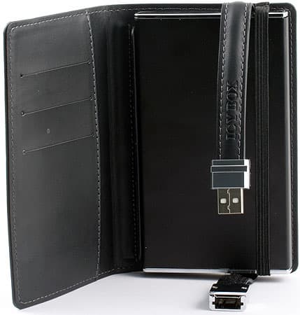 Подобная конструкция позволила обойтись и без банальных интерфейсных разъемов на корпусе модуля, кои уже надоели, честно говоря. В данном случае «общение с внешним миром» происходит исключительно через USB-кабель, причем в кожаной же, а не обычной пластиковой оплетке. В транспортировочном положении разъем защищен, причем металлический колпачок последнего прикреплен к такому же кожаному ремешку, так что эта конструкция в застегнутом положении еще и придерживает «обложку», выглядя как обычный ремень с пряжкой. Словом, в нерабочем состоянии визуально сложно определить, что перед нами именно внешний жесткий диск. Думаю, в результате, популярность последнему обеспечена — устройства, не похожие на конкурентов, спросом пользуются всегда. Особенно хорошо подобный накопитель подойдет тем, кто придерживается в одежде строгого делового стиля, поскольку не внесет в него никакого диссонанса.