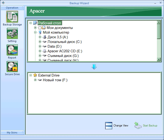 К каждому накопителю (как и ко многим SD-картам и флэшдрайвам компании) прилагается бесплатная двухмесячная лицензия Norton Internet Security 2009. Саму программу можно скачать с сайта Apacer — нужно только серийный номер устройства на специальной страничке ввести. Также на комплектном диске есть программа Backup Manager, период использования которой не ограничен :) Все, что она делает — обеспечивает возможность резервного копирования данных при помощи кнопки на корпусе, настраивает этот процесс, а также позволяет разбить накопитель на открытую и защищенную части.