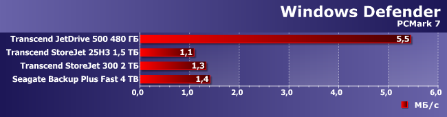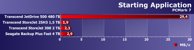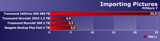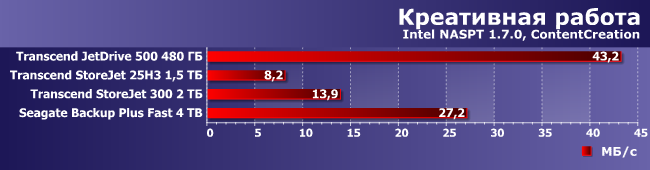 Вот как раз случай, когда Seagate Backup Plus Fast выглядит лучше всех при записи данных. Впрочем, как мы уже знаем есть внешние флэшки, которые работают быстрее, чем JetDrive 500, что смазывает радость от победы над ним. Да и вообще при такой нагрузке очень многое зависит от оптимизации ПО контроллера и винчестера (или SSD), что способно нивелировать различия между разными носителями данных и/или их организацией в конкретном устройстве.
