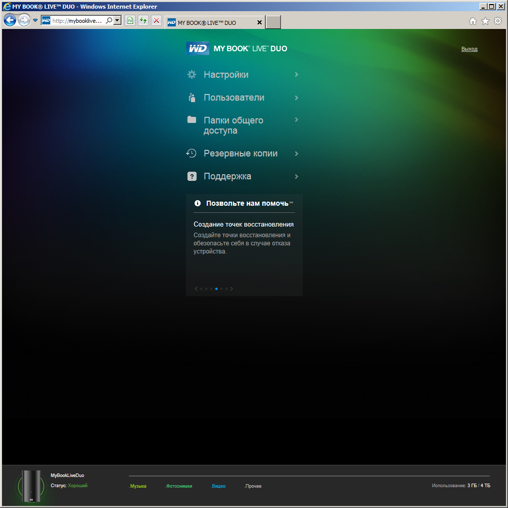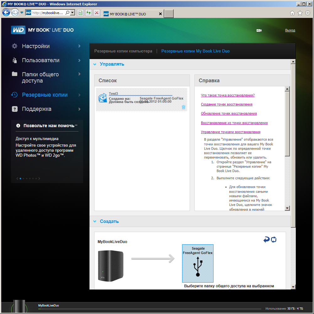 Для резервного копирования данных с ПК пользователя можно использовать встроенные в операционные системы средства — Backup and Restore (Windows) и Time Machine (Mac OS X) или комплектную программу WD SmartWare. Эта утилита поддерживает работу с разбивкой файлов по типам и может хранить несколько версий одного и того же документа. Интересно, что и Time Machine и SmartWare записывают свои копии в скрытые папки сетевого накопителя, доступ к которым имеют только они сами. Для удаления устаревших или ненужных копий из них можно использовать специальную страничку веб-интерфейса накопителя.