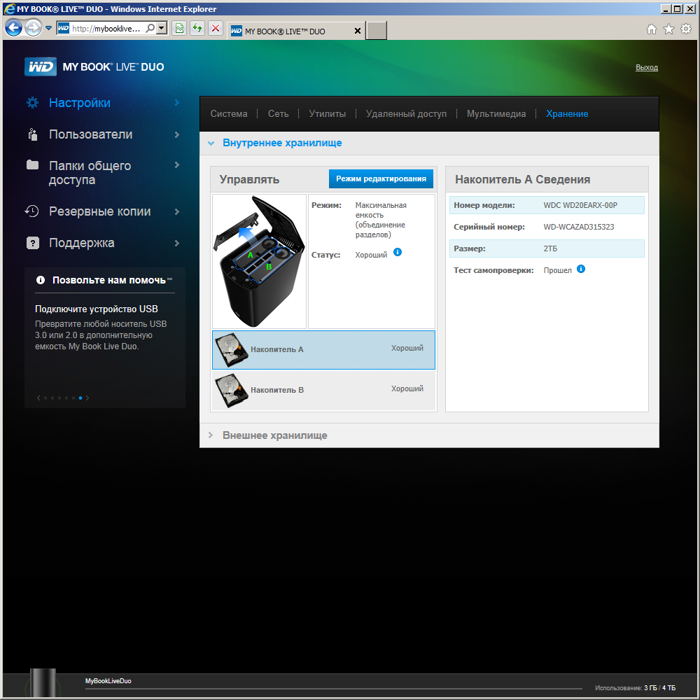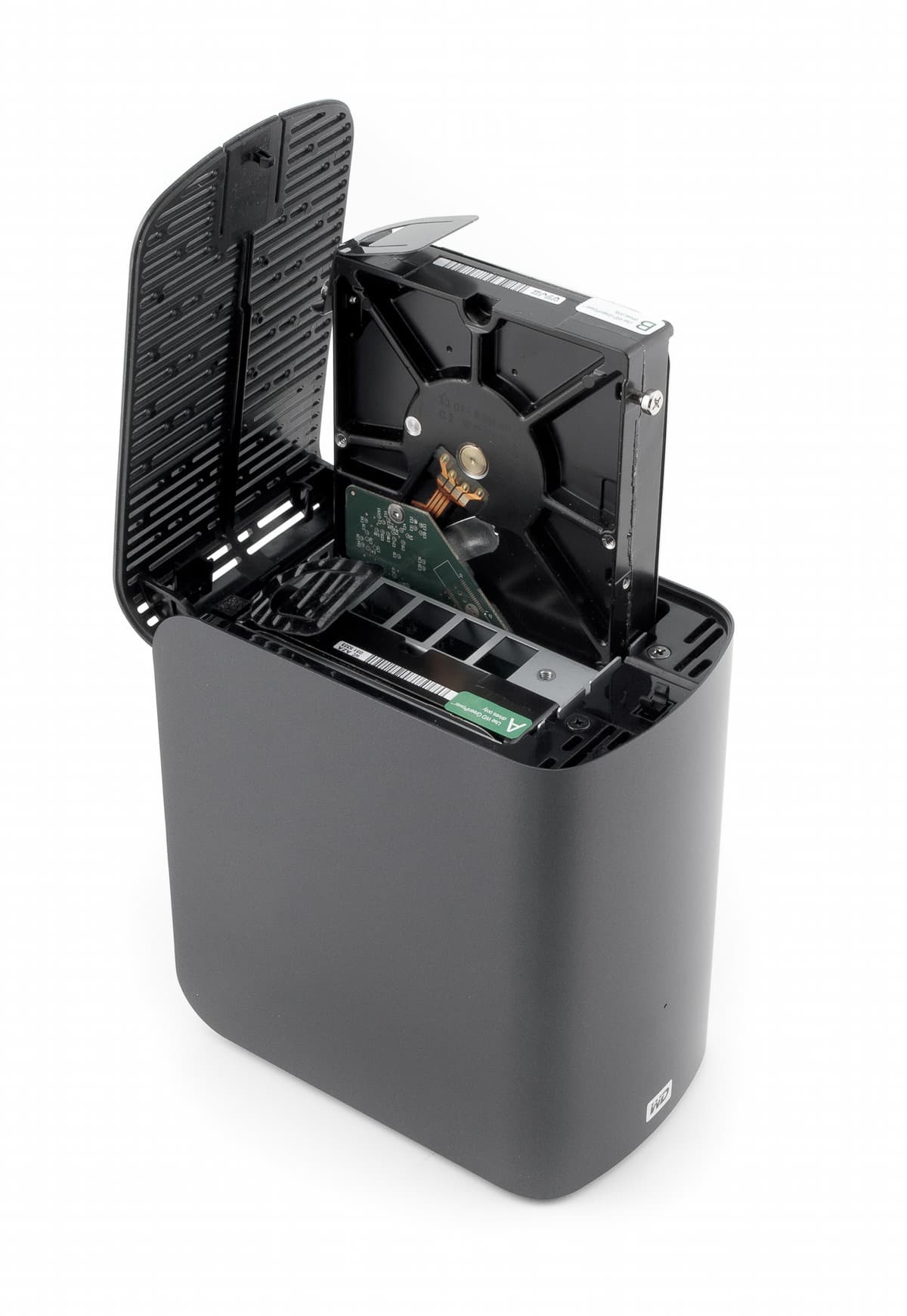 My Book Live Duo рассчитан на работу с двумя дисками, причем допускается их самостоятельная замена пользователем. В серии представлены две модификации — с винчестерами по 2 и по 3 ТБ, так что общий объем дискового пространства будет составлять 4 и 6 ТБ соответственно. В тестировании принимала участие младшая модель.