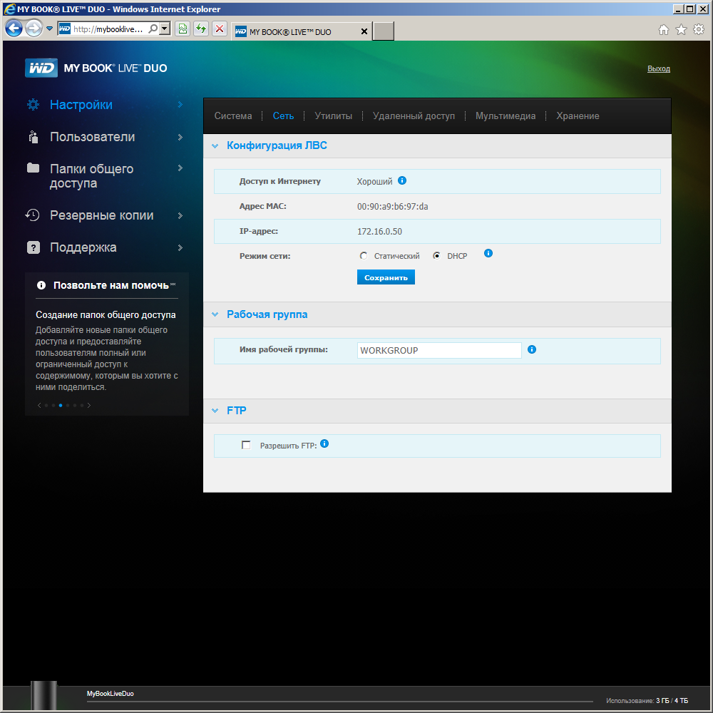 Настройки по-умолчанию с одной единственной общей папкой конечно не подойдут всем пользователям. Так что для управления параметрами работы нужно будет использовать веб-интерфейс устройства.