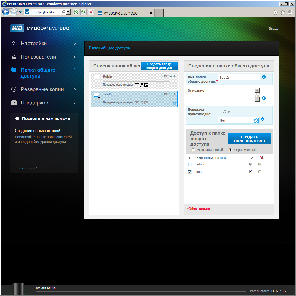 В дополнение к папке «Public», в устройстве можно создать и другие общие сетевые ресурсы. Для каждого из них выбирается режим доступа — неограниченный или с контролем пользователей. В последнем случае можно предоставить доступ только на чтение, полный или запретить любой вариант. Отметим, что для папки Public нельзя ничего изменить и удалить ее тоже нельзя. Для домашнего использования это может быть и не очень критично, но если речь идет о раздаче файлов по FTP через интернет, наличие неконтролируемого ресурса как минимум неудобно. При создании новых пользователей, кроме указания имени и пароля, можно сразу же выбрать доступные им сетевые ресурсы, а также создать персональную общую папку.