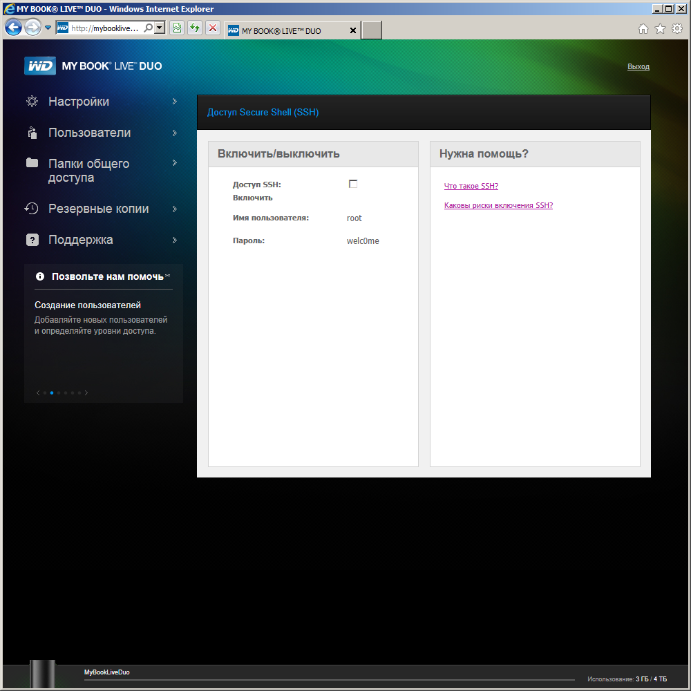 При доступе по специальной ссылке, пользователь сможет включить SSH-доступ к устройству и установить собственные программы и утилиты. Несмотря на то, что накопитель собран на относительно редкой сегодня аппаратной архитектуре PowerPC, ее каталог Optware не уступает ARM, а необходимые для работы этой функции файлы уже присутствуют в прошивке.