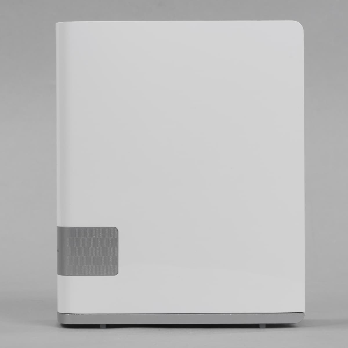 Устойчивости накопителю придают четыре резиновые ножки. На лицевой стороне есть небольшая серебристая вставка с логотипом, названием модели и многоцветным индикатором статуса, который в рабочем состоянии светится голубым. Интересно, что в настройках есть опция его выключения.
