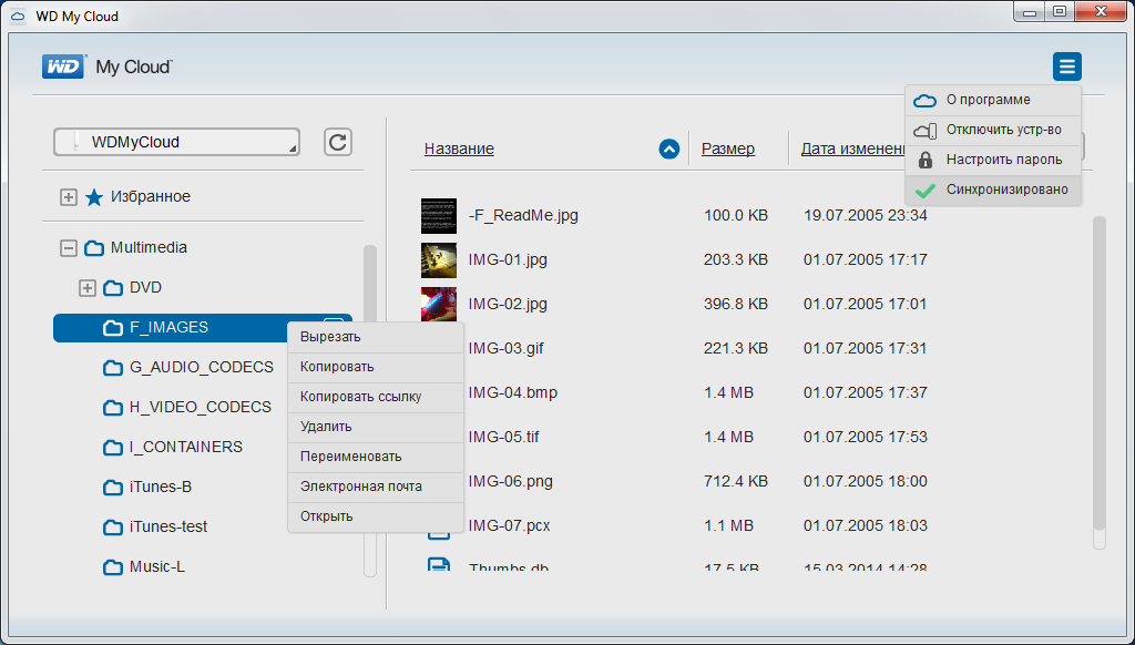 В качестве еще одного решения удаленного доступа есть фирменная программа WD My Cloud для операционных систем Windows и Mac OS. Она представляет собой менеджер файлов для сетевого накопителя, работающий как с локальным, так с удаленным подключением. При этом не нужно менять настройки при изменении типа подключения, можно использовать большинство стандартных операций, загружать новые файлы на устройство с использованием Drag-and-Drop, создавать прямые ссылки на загрузку документов для быстрого обмена информацией. Из дополнительных опций есть пункт выключения питания накопителя.