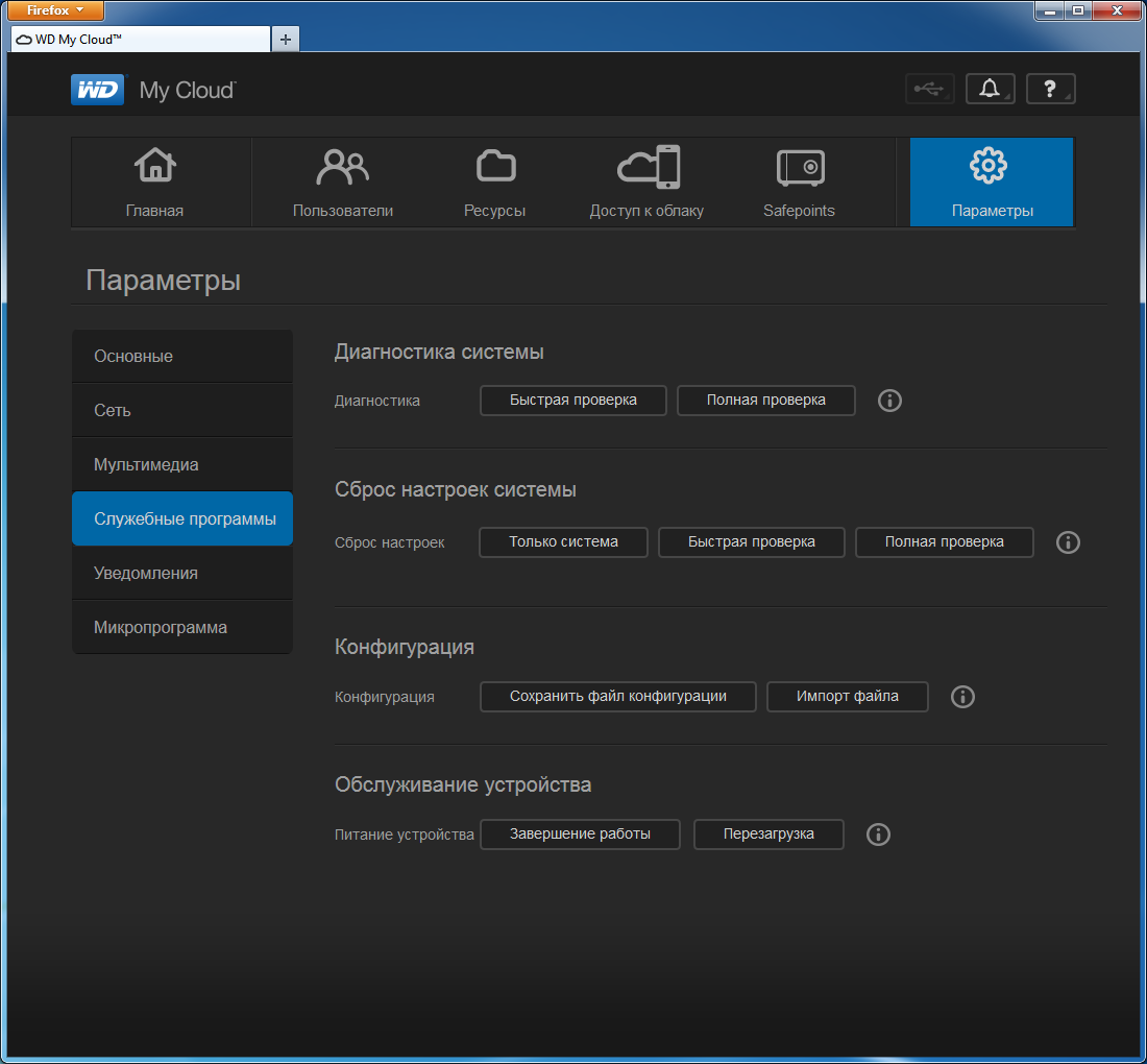 Традиционный набор системных опций включает в себя сброс, сохранение и восстановление конфигурации, выключение и перезагрузку накопителя, обновление прошивки (из файла и в автоматическом режиме). Также присутствует функция диагностики работы устройства. Скорее всего, в данном случае идет речь об использовании возможностей технологии S.M.A.R.T., но посмотреть текущее состояние параметров из Web-интерфейса нельзя.