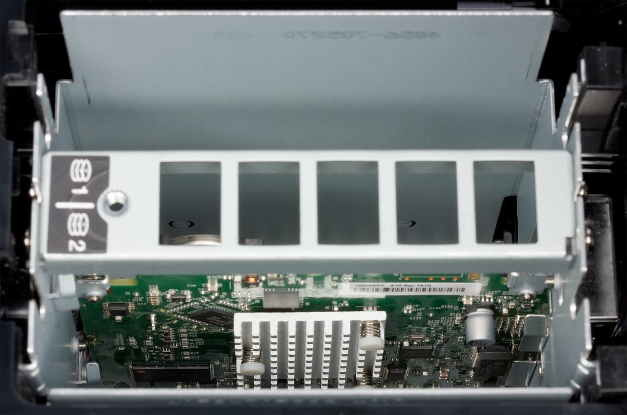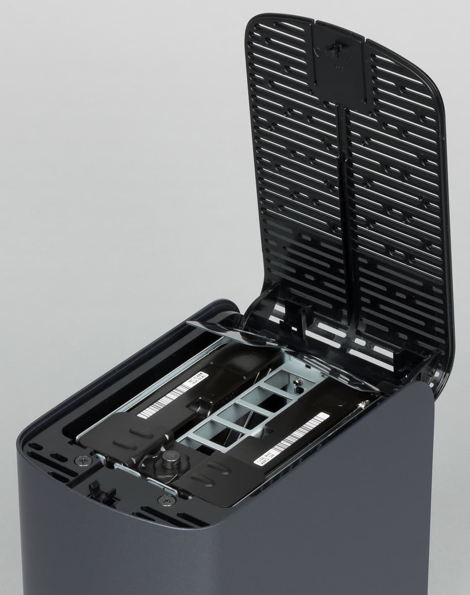 Диски доступны снаружи и внутри пользователю делать нечего. Кроме того, корпус разбирается достаточно сложно. Это может создавать проблемы для чистки внутреннего вентилятора. Впрочем, последний работает относительно редко и, по крайней мере, во время наших тестов, почти всегда был остановлен.