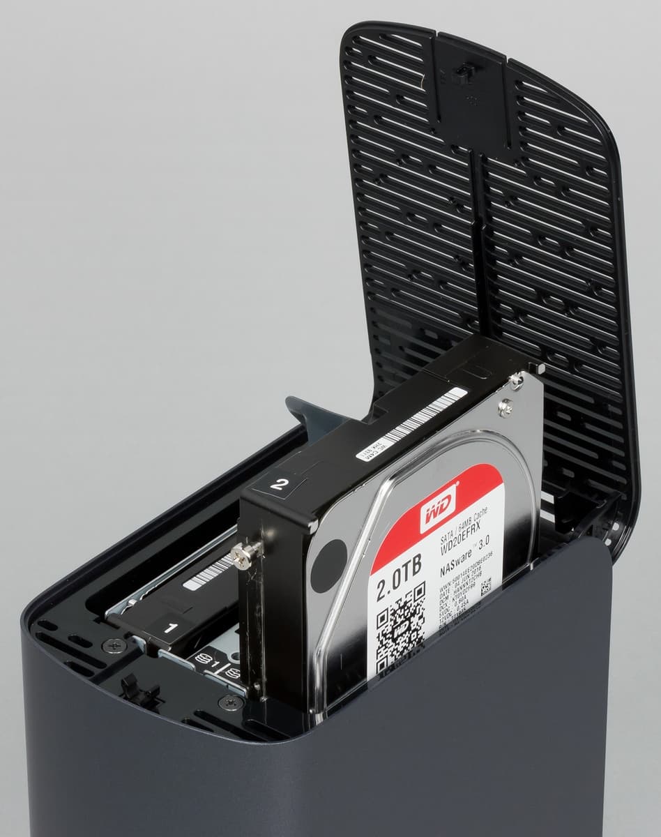 В нашем случае устройство поставлялось с жесткими дисками и было готово к работе «из коробки». В случае, если вы покупаете «пустую» модель, потребуется установить на каждый винчестер по два винта специальной формы, открыть верхнюю панель, демонтировать пластину крепления и вставить диски в соответствующие отсеки, потом собрать все в обратном порядке. Никаких сложностей с этими операциями быть не должно.