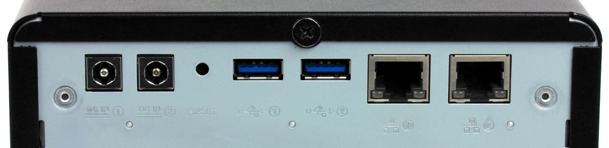 Все разъемы установлены в верхней части задней панели. Здесь мы видим два входа для блоков питания, два USB 3.0, два гигабитных сетевых порта с индикаторами и скрытую кнопку сброса. В нижнем правом углу заметно отверстие кенсингтонского замка. С точки зрения удобства подключения, верхнее расположение разъемов имеет как плюсы, так и минусы. Наличие двух входов для блока питания позволяет организовать конфигурацию с резервированием питания.