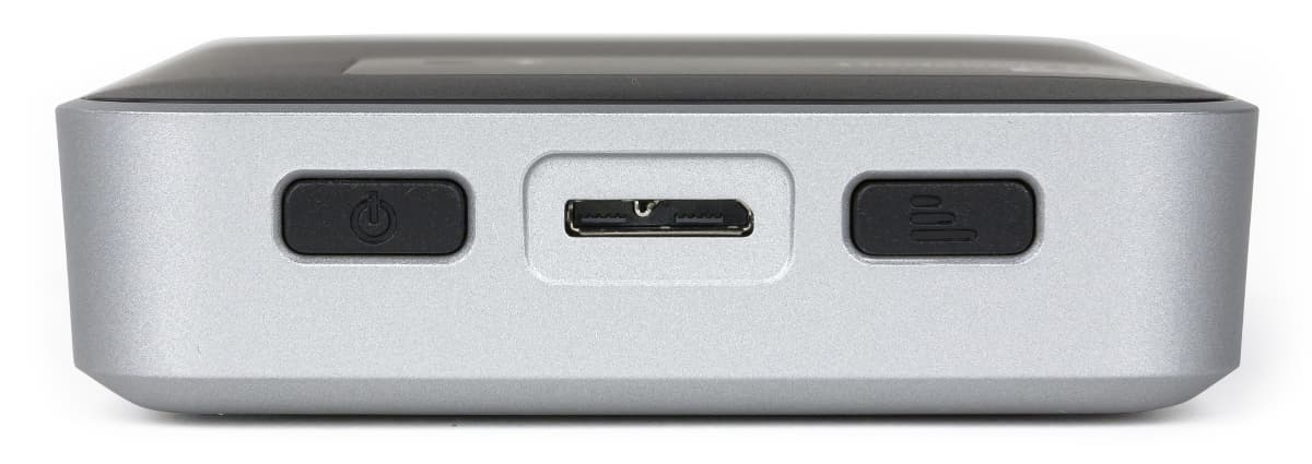 На верхнем торце накопителя установлены кнопки включения питания, управления беспроводными подключениями и порт Micro-USB 3.0. Вторая из кнопок имеет несколько функций, которые существенно упрощают работу с устройством. В частности короткое нажатие позволяет подключить клиента по беспроводной сети по технологии WPS, длительное начинает процесс подключения самого накопителя к беспроводной сети вашего роутера, нажатие в выключенном состоянии показывает уровень заряда батареи, а в случае установленной карты памяти кнопка запускает процесс копирования данных с нее на жесткий диск. Одновременное нажатие кнопок на десять секунд используется для сброса настроек накопителя.