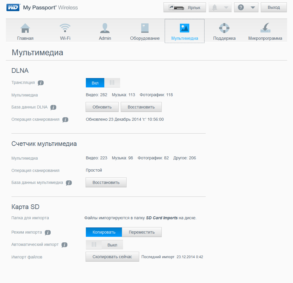 На странице «Мультимедиа» можно отключить сервер DLNA, запустить сканирование файлов, очистить его каталог, оценить количество найденных им мультимедийных файлов. Вторая графа — «Счетчик мультимедиа» — видимо представляет собой еще один индекс для оценки занимаемого разными файлами пространства на диске. Последний пункт здесь — настройка работы с картами памяти. Предусмотрена операция автоматического копирования данных с них при установке. Можно запустить ее и в ручном режиме. Копирование может быть заменено переносом, когда оригинальные файлы с карты памяти удаляются. Это может быть полезно для фото-видеосъемки.