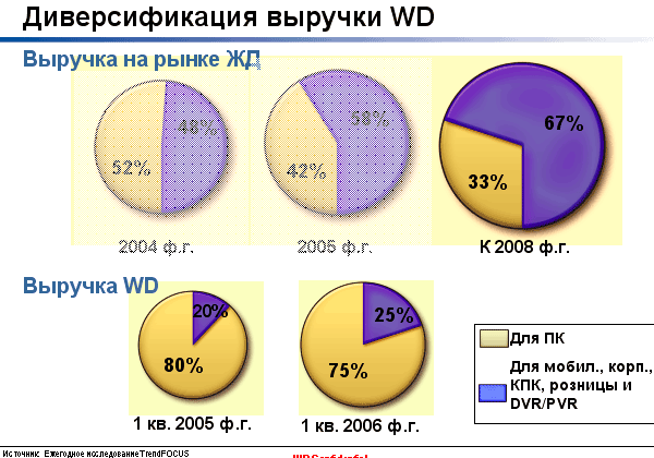 Итоги деятельности WD в первом квартале нового финансового года (закончившегося 30 сентября 2005 календарного года) действительно впечатляют: выручка компании в первом квартале составила 1 млрд. долларов, объём сбыта — примерно 17,1 млн. единиц продукции (то есть дисков), а чистый доход — 68,8 млн. долларов или 0,31 доллара на одну акцию с учетом 4,6 млн. долларов расходов на приобретение опционов. Валовая прибыль в отчётном квартале составила 17,7%, а на вырученные и освободившиеся средства WD выкупила примерно 1,1 млн. своих акций на общую сумму примерно 14 млн. долларов. Таким образом, с момента начала программы выкупа акций в мае 2004 года компанией было выкуплено примерно 7,8 миллиона своих акций на общую сумму примерно 75 млн. долларов. В нынешнее нелегкое время, когда большинство конкурентов еле сводят концы с концами, такие показатели — это достижение. И они в немалой мере обусловлены высоким спросом на рынках настольных ПК, ноутбуков и PVR/DVR — в первом квартале текущего финансового года компания отгрузила производителям ноутбуков, работающим на самом стремительно развивающемся в отрасли массовом рынке, более 1 миллиона 2,5-дюймовых жёстких дисков WD Scorpio для мобильных устройств. Кроме того, она реализовала примерно 1,3 миллиона 3,5-дюймовых жёстких дисков производителям персональных и цифровых устройств видеозаписи (PVR/DVR). По сведениям WD, 25% выручки в первом квартале она получила от сбыта товаров, не относящихся к рынку настольных ПК, таких как ноутбуки, бытовая электроника и системы корпоративного класса, а также от розничной торговли. Другие 75% квартальной выручки были получены от сбыта накопителей на жёстких дисках, устанавливавшихся в настольные ПК. Уровень спроса на продукцию WD на данном рынке по-прежнему остаётся стабильно высоким. Для сравнения, в аналогичном квартале прошлого года доля выручки из источников, не относящихся к настольным ПК, составляла 20%, а доля выручки от сбыта жёстких дисков для настольных ПК — 80%.