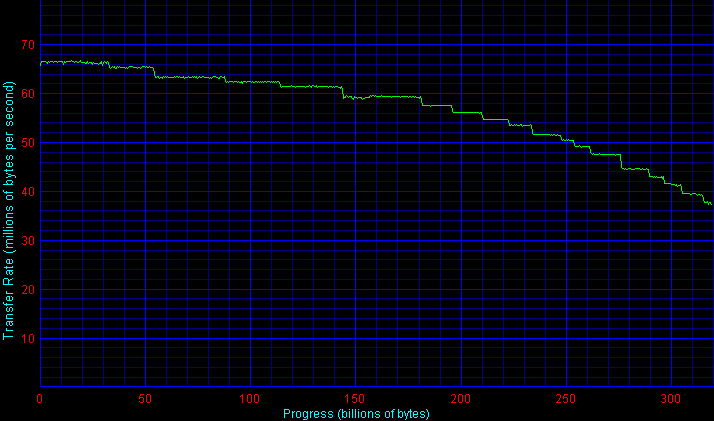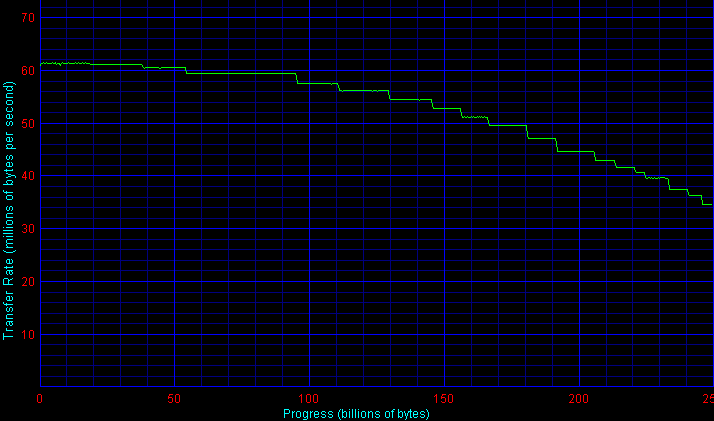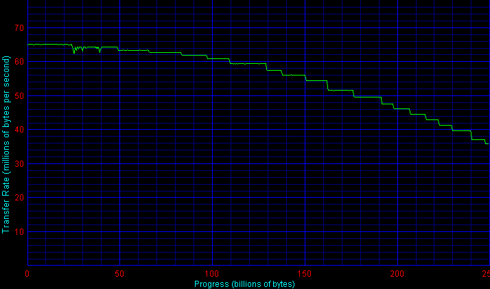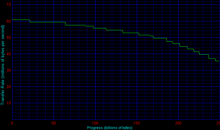 Очевидно, что максимальная и средняя линейная скорость доступа для WD2500JS слегка уступает таковой для выпущенных немного ранее дисков WD3200Jx (попутно отмечу, что график современных WD1600JS в точности совпадает по зонам с таковым для WD3200JD!). Видимо, это связано с тем, что для последних пластины форматируются на максимально возможную для WD в данный момент (пока 500-ки не вышли на рынок) емкость 107 Гбайт, тогда как 250-гигабайтникам вполне достаточно использования 100-гигабайтных пластин. То, что здесь используется именно последняя технология 100-гигабайтных, а не прежних 80-гигабайтных пластин (и соответствующих головок), легко видеть из сравнения графиков для WD2500JS и годичной давности дисков WD2500JD, демонстрирующих на 8-10% более низкие значения. Впрочем, спецификации WD утверждают, что WD2500JS по-прежнему использует 6 головок (а не 5, как можно было бы предположить из факта использования 100-гигабайтных пластин), хотя рабочая область пластин при этом и не уменьшается с одной из сторон, как было в прежние годы, например, у Maxtor и Seagate. Об этом же (6 головок) свидетельствуют данные и из part_number_description производителя. Впрочем, я не могу исключать и того, что из указанного числа головок одна в данном случае может быть просто отключена на уровне firmware и транслятора (например, для WD1600JS в part_number_description также указано 4, а не 3 головки, хотя по графикам для зон он полностью идентичен WD3200Jx с шестью головками).