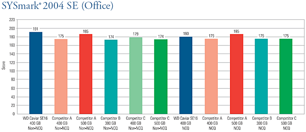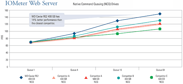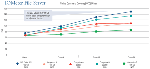 При этом WD даже гордо демонстрирует результаты серверных тестов, в которых WD4000YR при работе с NCQ-хост-контроллером показывает отличные результаты: