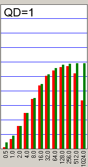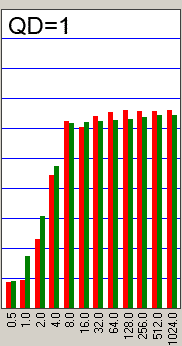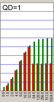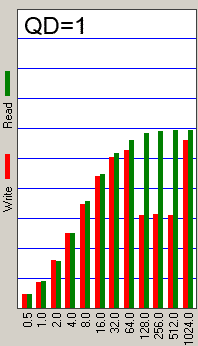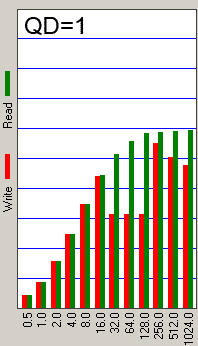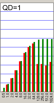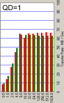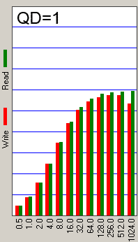 Теперь запасемся валидолом и перейдем к записи (красные столбики на диаграммах; их цвет как нельзя лучше отражает нашу тревогу). :) Сначала взглянем на наиболее чистый случай, когда NCQ отключена — это правая колонка скриншотов. Самые крупные файлы (32 Мбайт) записываются практически с такой же скоростью, как и читаются, а несколько меньшая скорость работы на самых мелких блоках при единичной глубине очереди (по сравнению с QD=4 и 9) легко объясняется кэширующим действием микропрограммы самого диска и, возможно, применяемого контроллера. Пока все хорошо, а высокая скорость работы с мелкими блоками у данного диска не может не радовать.