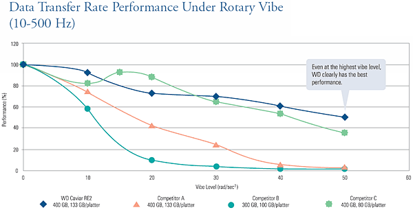 Результат использования такой технологии не замедлил сказаться: на графике ниже представлена полученная в лаборатории WD зависимость скорости линейного доступа к диску в зависимости от степени вибрации накопителя в диапазоне частот от 10 до 500 Гц.